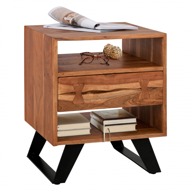 Ανακαλύψτε το μοναδικό χειροποίητο κομοδίνο από φυσικό μασίφ ξύλο ακακίας! Ως ιδιαίτερο χαρακτηριστικό, η πρόσοψη του συρταριού επεξεργάστηκε για να δημιουργήσει τον αρχικό χαρακτήρα και τη φυσική εντύπωση μιας φέτας από ένα τεράστιο δέντρο. Κομοδίνο από μασίφ ξύλο Ακακίας σε φυσική απόχρωση και μεταλλικά πόδια σε μαύρο χρώμα. Διαθέτει 1 συρτάρι και 2 ράφια, για να αποθηκεύσετε τα πράγματα σας. Ένα διαχρονικό έπιπλο που αντέχει στο πέρασμα του χρόνου, με εξαιρετικό φινίρισμα εμπνευσμένο από την φύση, όπου το ξύλο έχει τον πρώτο ρόλο. Διαστάσεις: 45x35x57Y εκ. Σημείωση: Το προϊόν είναι κατασκευασμένο από φυσικό μασίφ ξύλο ακακίας και κάθε ένα είναι μοναδικό λόγω της ανομοιομορφίας των κορμών των δένδρων. Οι υπάρχουσες ρωγμές ή αυτές που ενδέχεται να δημιουργηθούν με την πάροδο του χρόνου δίνουν πρωτοτυπία και μοναδικό design στο χώρο σας. Κατά τη διαδικασία παραγωγής γίνεται ομοιομορφοποίηση και σταθεροποίηση των ρωγμών που υπάρχουν, με υλικό κατασκευασμένο από το ίδιο ξύλο. Επομένως, μπορεί να υπάρχουν χρωματικές παραλλαγές και διαφορές στις διαστάσεις του προϊόντος λόγω των διαστάσεων του επεξεργασμένου ξύλου. Αυτά δεν αποτελούν ελάττωμα του προϊόντος. Το προϊόν διατίθεται αμοντάριστο σε εργοστασιακή συσκευασία.