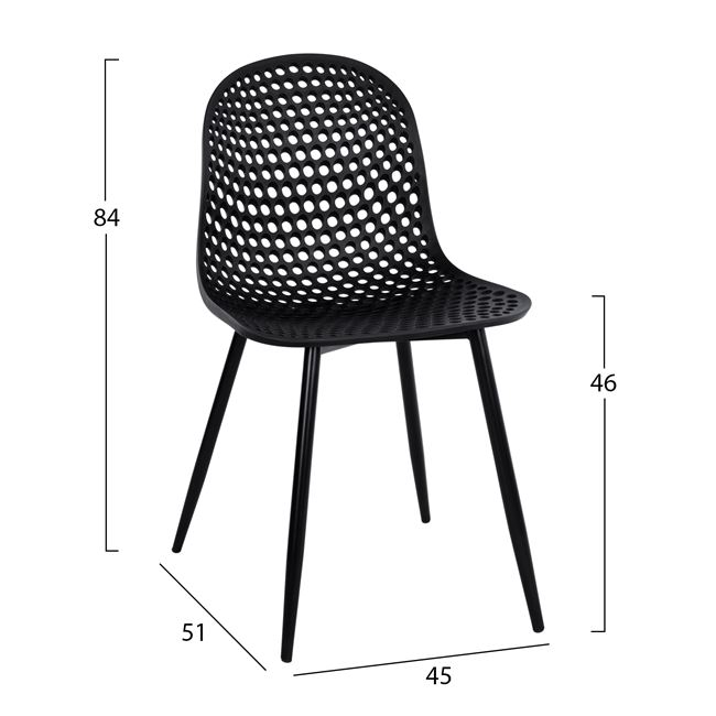 Ανάλογα με την διακόσμηση του σπιτιού σας, μπορείτε να βρείτε τα κατάλληλα έπιπλα που θα συνθέσουν μία όμορφη και μοντέρνα τραπεζαρία. Η κατασκευή της καρέκλα MILANA είναι από πολυπροπιλένιο και μέταλλο σε μαύρη απόχρωση. Τα πόδια είναι μεταλλικά για μεγαλύτερη αντοχή. Διαστάσεις: 45x51x84 εκ. Ύψος καθίσματος: 46 εκ. Διαστάσεις καθίσματος: 45,5x38 εκ.