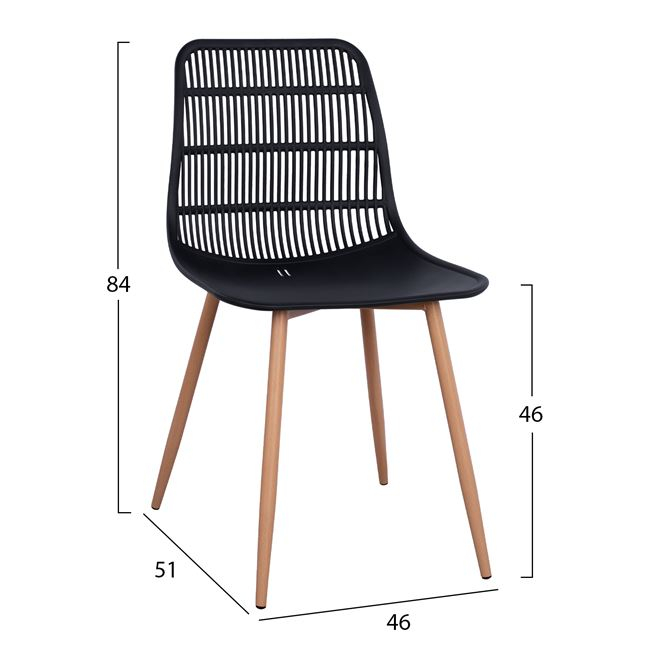 Ανάλογα με την διακόσμηση του σπιτιού σας, μπορείτε να βρείτε τα κατάλληλα έπιπλα που θα συνθέσουν μία όμορφη και μοντέρνα τραπεζαρία. Η κατασκευή της καρέκλα GIOSSETA είναι από πολυπροπιλένιο σε μαύρη απόχρωση και μέταλλο. Τα πόδια είναι μεταλλικά για μεγαλύτερη αντοχή, βαμμένα στο χρώμα του ξύλου, δίνοντας τους την όψη του φυσικού. Διαστάσεις: 46x51x84 εκ. Ύψος καθίσματος: 46 εκ. Διαστάσεις καθίσματος: 46x41 εκ.