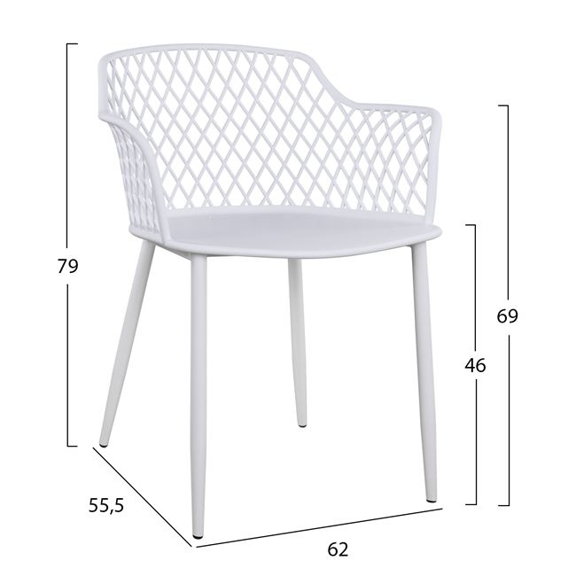 Ανάλογα με την διακόσμηση του σπιτιού σας, μπορείτε να βρείτε τα κατάλληλα έπιπλα που θα συνθέσουν μία όμορφη και μοντέρνα τραπεζαρία. Η κατασκευή της πολυθρόνας JOCELYN είναι από πολυπροπιλένιο και μέταλλο σε λευκή απόχρωση. Τα πόδια είναι μεταλλικά για μεγαλύτερη αντοχή. Διαστάσεις: 62x55,5x79 εκ. Ύψος καθίσματος: 46 εκ. Ύψος μπράτσων: 69 εκ. Διαστάσεις καθίσματος: 49x44 εκ.