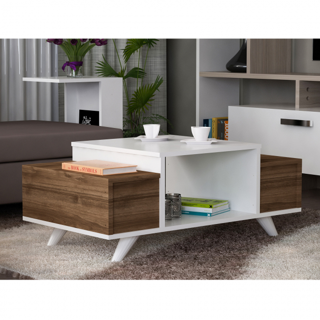 Τραπέζι σαλονιού σε διακριτική διχρωμία λευκού και καρυδί χρώματος. Η κομψότητα, η ποιότητα και το minimal design του, είναι κάποια χαρακτηριστικά από το τραπέζι σαλονιού, που έχει φτιαχτεί για εσένα. Μοντέρνος σχεδιασμός με ανθεκτικά υλικά. Διαθέτει τρεις επιφάνειες στο επάνω μέρος, έναν ανοιχτό αποθηκευτικό χώρο στο κάτω κεντρικό μέρος του και δύο ντουλάπια δεξιά και αριστερά σε καρυδί απόχρωση. Κατασκευασμένο από μελαμίνη πάχους 18mm υψηλής ποιότητας, με αντοχή στην φθορά και τον χρόνο. Χρώμα: Λευκό - Καρυδί Διαστάσεις: 90x50x35 εκ. Ευρωπαϊκής κατασκευής και προέλευσης. Το προϊόν διατίθεται αμοντάριστο σε εργοστασιακή συσκευασία.