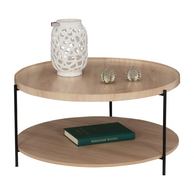 Τραπέζι σαλονιού δύο επιπέδων, σε απόχρωση φυσικό με μαύρο Φ75x40Y εκ. Ένα βοηθητικό έπιπλο με μεγάλη ανθεκτικότητα και λειτουργικότητα, απαραίτητο για το σπίτι ή το γραφείο. Διαθέτει σταθερό σκελετό,κομψό, λιτό αλλά παράλληλα καλαίσθητο, που θα δώσει νέα πνοή στο χώρο σας. Κατασκευασμένο από μεταλλικό μαύρο σκελετό, και κυρίως επιφάνεια από υψηλής ποιότητας μελαμίνη, με αντοχή στη φθορά και στο χρόνο. Γενικές Διαστάσεις: Φ75x40 εκ. Διαστάσεις Ραφιού: Φ75x27 εκ. Το προϊόν διατίθεται αμοντάριστο σε εργοστασιακή συσκευασία.