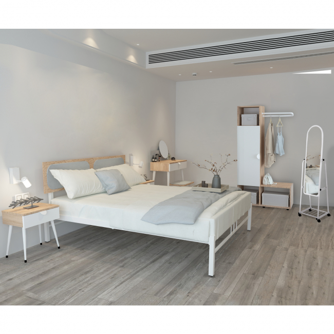 Σετ 6 τμχ περιέχει ένα διπλό κρεβάτι, μια ντουλάπα, μια τουαλέτα με καθρέπτη, ένα σκαμπό, ένα κομοδίνο και ένα καθρέπτη δαπέδου. Κωδ. HM603 Ένα διπλό κρεβάτι, κατασκευασμένο από μεταλλικό σκελετό και μελαμίνη. Το κρεβάτι διαθέτει ενσωματωμένα μαξιλάρια στο προσκέφαλο. Διαστάσεις: 170x207x111 εκ. Απόχρωση: Sonama - Λευκό Κωδ. HM9174 Ένα έπιπλο εισόδου, κατασκευασμένο από μελαμίνη υψηλής ποιότητας και μέταλλο. Διαθέτει ένα ντουλάπι, τρεις ανοιχτούς αποθηκευτικούς χώρους και μεταλλική βάση για κρέμαση ρούχων. Διαστάσεις: 82x36x165 εκ. Απόχρωση: Sonama - Λευκό Κωδ. HM9176 Μια τουαλέτα με καθρέπτη, κατασκευασμένη από μεταλλικό σκελετό και μελαμίνη υψηλής ποιότητας. Επίσης διαθέτει ένα συρτάρι. Διαστάσεις: 80x40x120 εκ. Απόχρωση: Sonama - Λευκό Κωδ. HM9209 Ένα σκαμπό για να το συνδυάσετε με την τουαλέτα, κατασκευασμένο από μεταλλικό σκελετό και μελαμίνη υψηλής ποιότητας με ενσωματωμένο μαξιλαράκι στο κάθισμα. Διαστάσεις: 40x30x40 εκ. Απόχρωση: Sonama - Λευκό Κωδ. HM9177 Ένα κομοδίνο με ένα συρτάρι, κατασκευασμένο από μεταλλικό σκελετό και μελαμίνη υψηλής ποιότητας. Διαστάσεις: 45x36x55 εκ. Απόχρωση: Sonama - Λευκό Κωδ. HM8262.01 Ένα καθρέπτη δαπέδου με ρόδες, κατασκευασμένο από μέταλλο. Διαστάσεις: 43x37,5x160Υ εκ. Απόχρωση: Λευκό