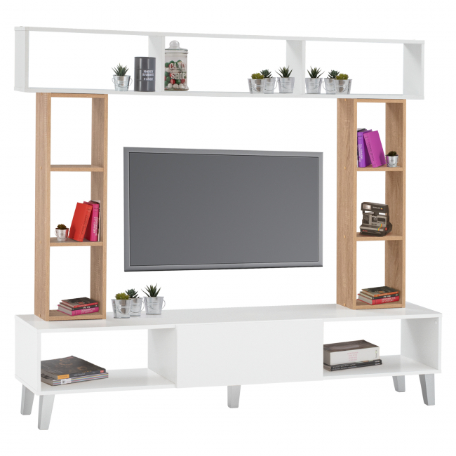 • Περιγραφή: Σύνθεση τηλεόρασης σε μοντέρνο αλλά και λιτό σχεδιασμό, κατασκευασμένο από ανθεκτική μελαμίνη υψηλής ποιότητας, απόχρωση sonama με λευκό. Διαθέτει δυο πλαϊνά ράφια και ένα πάνω ράφι με χώρους αποθήκευσης όλων των αγαπημένων αντικειμένων σας. Ο μοντέρνος και λιτός σχεδιασμός, είναι κάποια από τα χαρακτηριστικά που ζητάς για την αισθητική του σαλονιού σου, προσφέροντας παράλληλα και πρακτικότητα με τους μεγάλους χώρους αποθήκευσης. Διαστάσεις: 180,5x32x155,5 εκ. Διαστάσεις μονάδας TV: 180,5x32x40 εκ. Διαστάσεις αποθηκευτικων χώρων: 56x30x22,5 εκ. (x2) Διαστάσεις ντουλαπιού: 62x30x22,5 εκ. Διαστάσεις πλαϊνών ραφιερών: 25x14,5x90,5 εκ. Διαστάσεις αποθηκευτικού χώρου: 22,5x14,5x28,5 (x3) Διαστάσεις πάνω ραφιού: 180,5x14,5x25,5 εκ. Εσωτερικές διαστάσεις πάνω ραφιού Α: 56x14,5x22,5 εκ. (x2) Εσωτερικές διαστάσεις πάνω ραφιού B: 62x14,5x22,5 εκ. Το προϊόν διατίθεται αμοντάριστο σε εργοστασιακή συσκευασία.