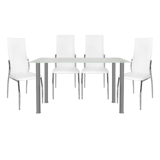ΤΟ ΣΕΤ ΠΕΡΙΛΑΜΒΑΝΕΙ Ένα τραπέζι με γυαλί ασφαλείας 8mm και μεταλλικά πόδια βαμμένα με ηλεκτροστατική βαφή. Xρώμα γυαλιού.Αμμοβολής. Χρώμα μετάλλου.Γκρί μάτ. Διαστάσεις.120Χ70Χ75 ύψος. Τέσερις καρέκλες κουζίνας από μεταλλικό σκελετό χρωμίου και επένδυση από δερματίνη σε λευκό χρώμα. Διαστάσεις εξωτερικές: 99εκ ύψος x 45εκ φάρδος x 55εκ βάθος Διάσταση καθίσματος καθαρό: 42εκ x 38εκ Διάσταση πλάτης καθαρό: 38εκ x 59εκ Ύψος καθίσματος: 44,5εκ ΠΡΟΣΟΧΗ: Το προϊόν διατίθεται αμοντάριστο σε πακέτο.