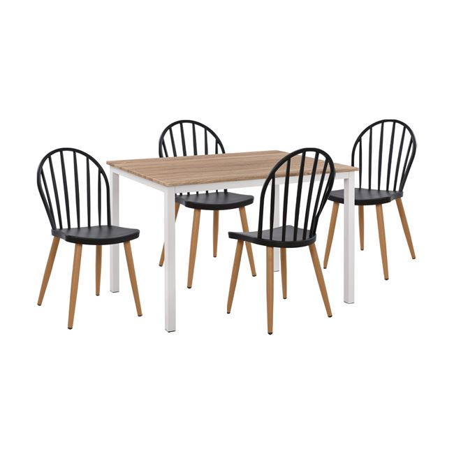 ΤΟ ΣΕΤ ΠΕΡΙΛΑΜΒΑΝΕΙ Ένα ελκυστικό και μοντέρνο τραπέζι με μεταλλική βάση λευκής απόχρωσης και sonama επιφάνεια από mdf. Διαστάσεις: 110x70x76 εκ. Πάχος επιφάνειας: 1,5 εκ. Τέσσερις καρέκλες με κάθισμα από πολυπροπυλένιο σε μαύρη απόχρωση και μεταλλικά πόδια με απόδοση στο φυσικό χρώμα του ξύλου. Διαστάσεις: 47x50,5x93 εκ. Ύψος καθίσματος: 47 εκ. Διαστάσεις καθίσματος: 45x40 εκ.