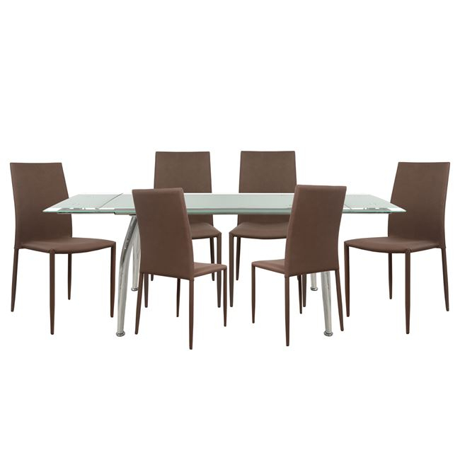 Η τραπεζαρία σας, που είναι ένα από τα πιο σημαντικά στοιχεία του σαλονιού, πρέπει να κρατήσει τη λαμπερή εμφάνισή της για όσο περισσότερο καιρό γίνεται γιατί τις περισσότερες φορές οι τραπεζαρίες που διατηρούν τη γυαλάδα τους καταφέρνουν να «κρύβουν» τα χρόνια τους με μεγάλη επιτυχία. Με ένα τραπέζι από γυαλί μπορείτε να πετύχετε αυτό το αποτέλεσμα ενώ παράλληλα ο συνδυασμός υλικών, όπως σίδερο, μέταλλο ή γυαλί έχει εξαιρετικά αποτελέσματα. Το σετ αποτελείται από 1 τραπέζι και 6 καρέκλες ΤΡΑΠΕΖΙ: Ένα τραπέζι από γυαλί ασφαλείας 10mm με την δυνατότητα επέκτασης και μεταλλικά πόδια. Χρώμα γυαλιού: Λευκό. Χρώμα μετάλλου: Χρώμιο. Διαστάσεις: 120+50x80x75 εκ. ΚΑΡΕΚΛΑ: Έξι καρέκλες κουζίνας από μεταλλικό σκελετό και επένδυση από ύφασμα σε καφέ απόχρωση. Διαστάσεις: 42,5x50x92 εκ. Ύψος καθίσματος: 46,5 εκ. Διαστάσεις καθίσματος: 43x39 εκ. Διαστάσεις πλάτης: 41x48 εκ. Το προϊόν παραδίδεται σε πακέτο ασυναρμολόγητο. TIP : Διακοσμήστε την τραπεζαρία σας με υπέροχα υφάσματα και τραβέρσες και χαρίστε τους στιλ προσθέτοντας ένα βάζο ή μια υπέροχη πιατέλα!