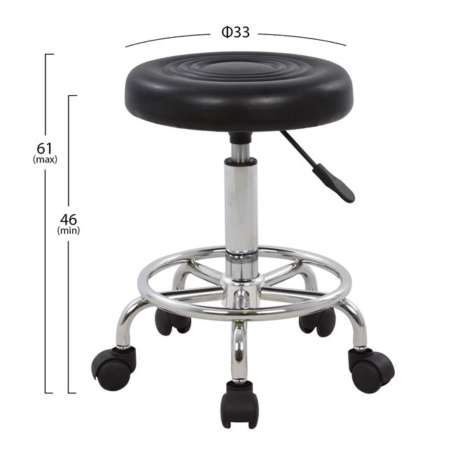 Τροχήλατο σκαμπώ σχεδιαστηρίου με μαύρο PU στο κάθισμα. Διαστάσεις καθίσματος: Φ33 εκ. Μέγιστο ύψος 61 εκ. Ελάχιστο ύψος 46 εκ.